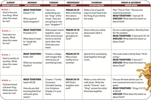 Week 1 – What We're Learning This week we will study Israel’s first king, Saul (1 Samuel 8; 13; 15). Though chosen to lead, Saul disobeyed God, feared his enemies, and acted as if he were the ultimate authority. Because of this, God ended Saul’s reign. The Israelites wanted a human king, but even their king chose his way over God’s. We often do the same—letting sin or other things rule us. But God...