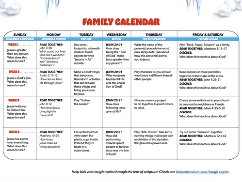 Week 1: What We're Learning! Hey parents! Take a look at what we're learning this weekend.Important Note: **January 18th is our CCW Kids' PARENTS 1st semester meeting. Lunch will be provided. Come get important dates and plans for your kids' calendar!**Jesus’ Baptism and Temptation (Matthew 3:13–17, 4:1–17; John 1:29–34)Brite Idea (Elementary): Jesus is God’s Son.This Month’s Big Question (Presch...